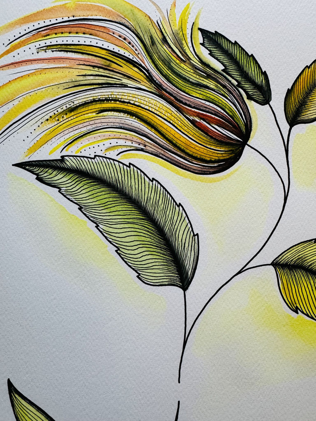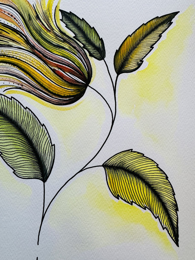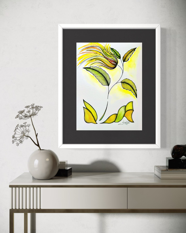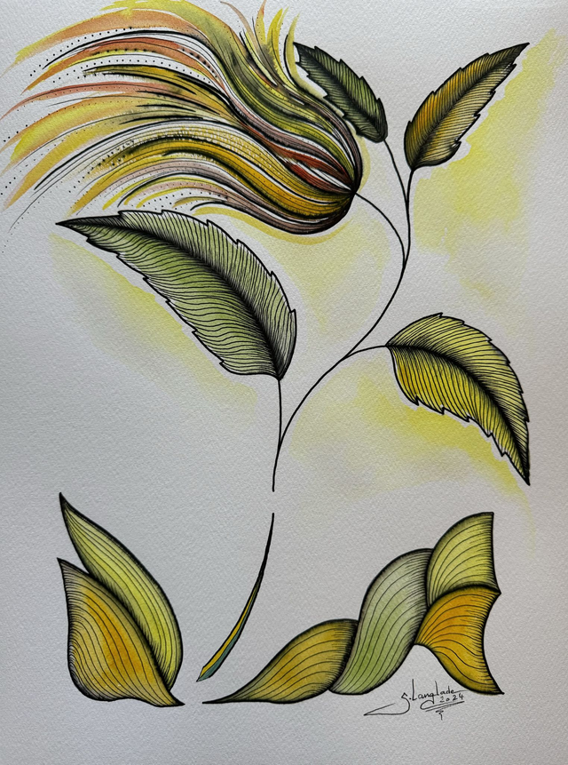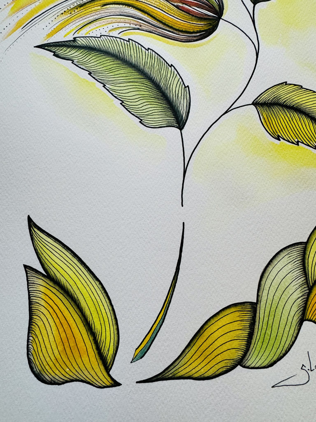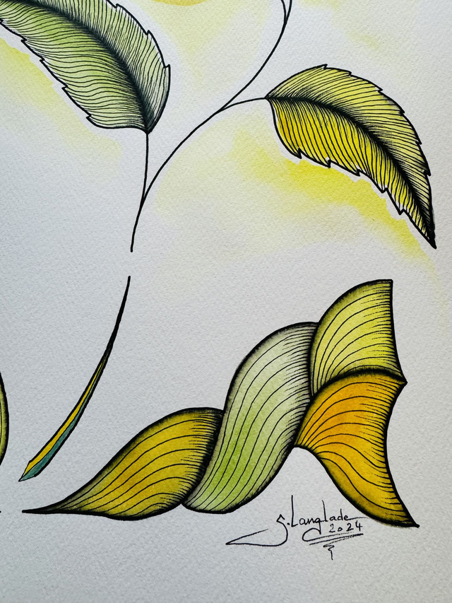 Oeuvre d'une étonnante sobriété, à la fois dans la palette de couleurs et dans la composition. Véritable ode à la vie, elle invite au mouvement et à la sérénité dans un cadre automnal. Légèreté de l'ensemble, minutie des motifs graphiques entièrement réalisés à main levée.